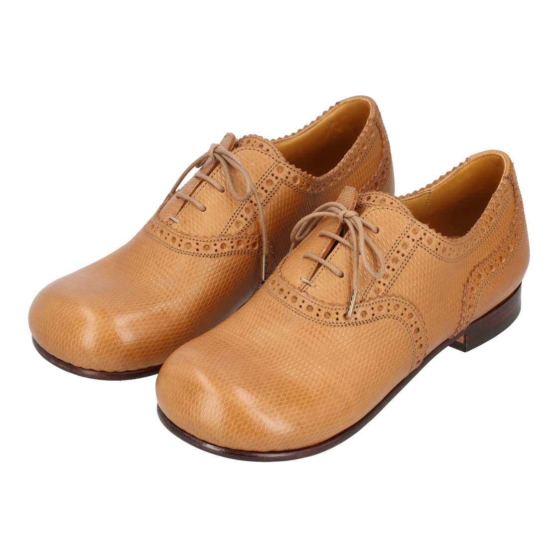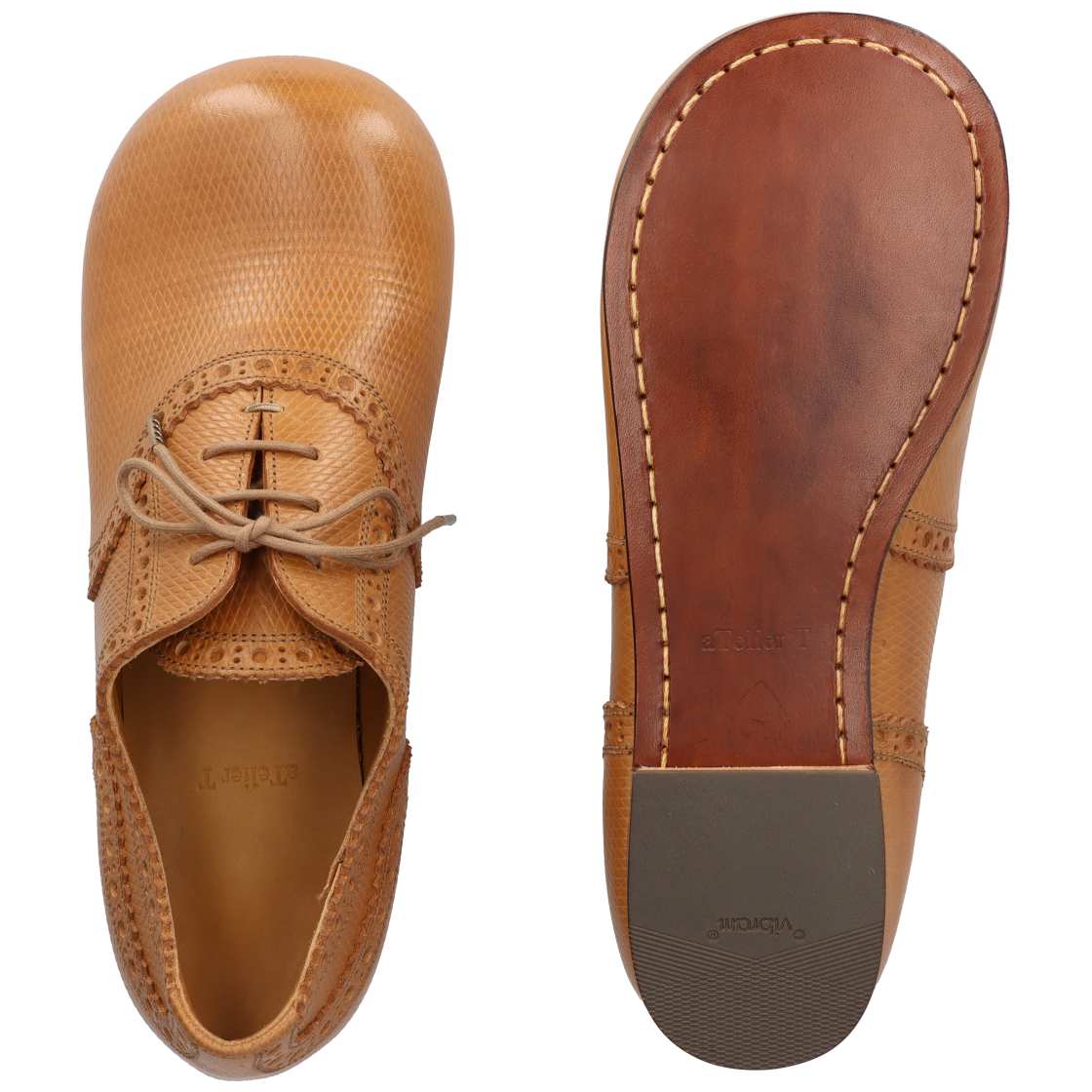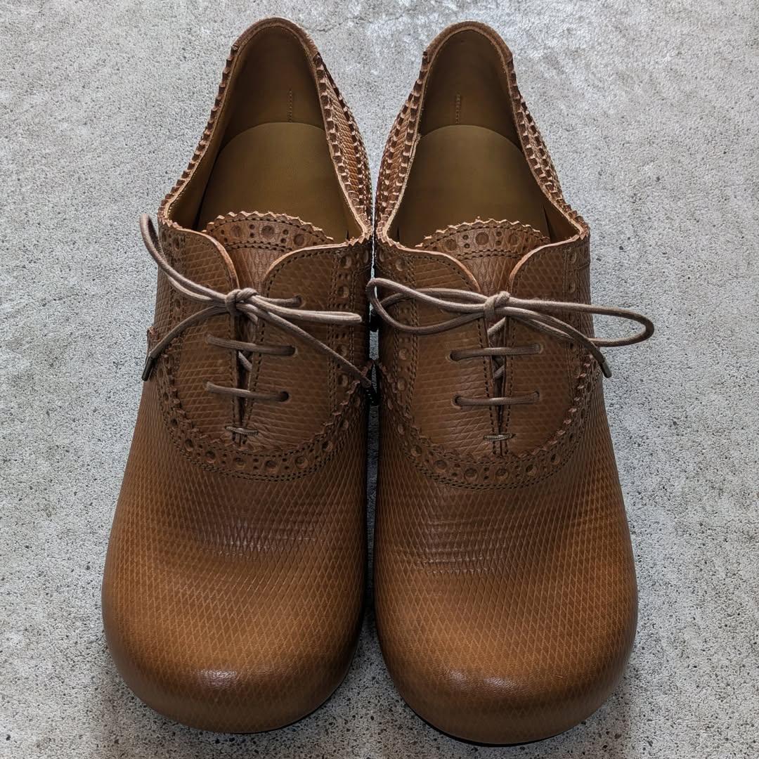 aTelier T「DECO」シリーズの新作。トラディショナルなフル・セミ・クォーターブローグのいずれにも当てはまらない独自の“プレーントゥブローグ”。丸い木型に呼応して大きめの親子穴を配し、品のあるラギッド感を醸成。アッパーはロシアンカーフから着想のダイヤ柄が特徴のオリジナルレザーをタンナーに別注。底付けは返りの良いマッケイ製法。張り出しを抑えた丸コバに熱ゴテを当て、引き締まった佇まいを狙っています。名称「DECO」は“おでこ”のような丸いつま先に由来。