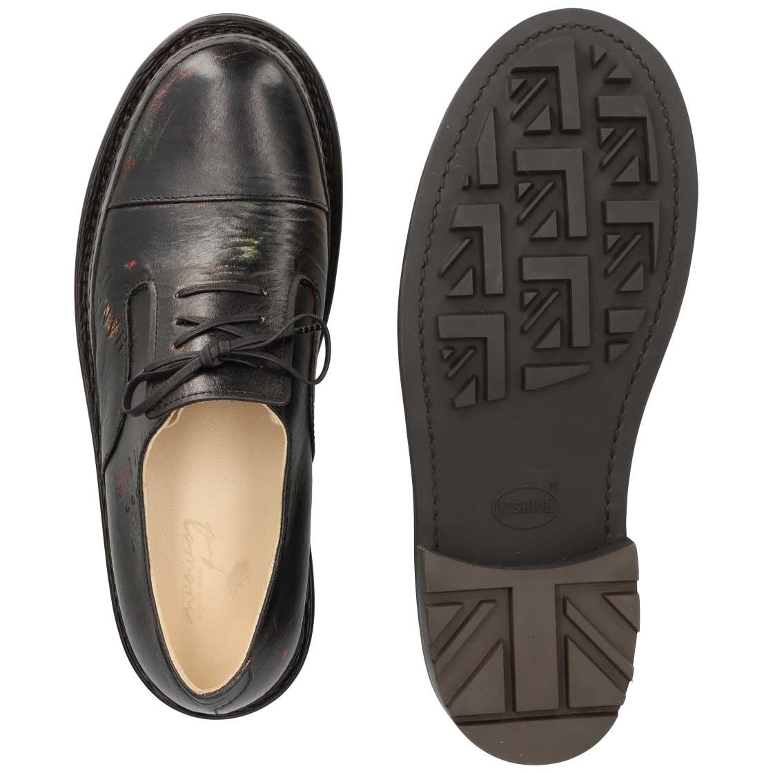 革製品を常用する人は年々減りつつある。そこで早くから革を身近に感じられる体験として、ヌメ革への自由な刻印や落書きを子ども達にしてもらった。その革を染めてアクリル塗料で覆ったものを素材とした。履き込むほどに塗料が削れ下地の色が現れる仕掛けは、引っかき絵から着想を得ている。革靴の上品さを忘れ、奔放に履くことで経年変化が色彩となって浮かび上がる。本作は「エポカルタン靴」として製作した。タン周りがエポカル(画期的)な構造の短靴、という意味合いのオリジナルデザインである。加えて、重厚感のある靴底で流行を取り入れた。10mm厚のEVA素材を内蔵するためにサイドテープを用い、ステッチダウンで仕上げている。
