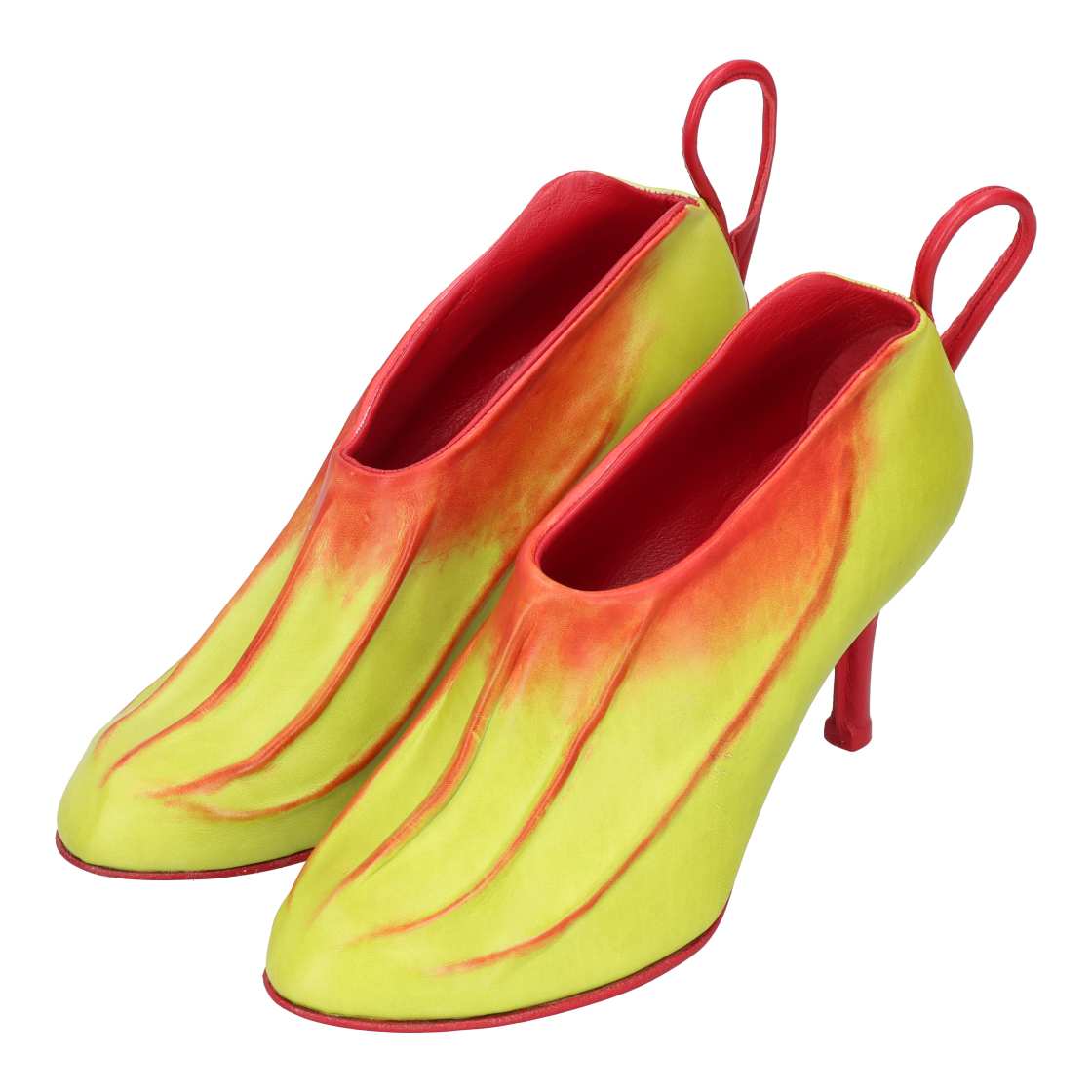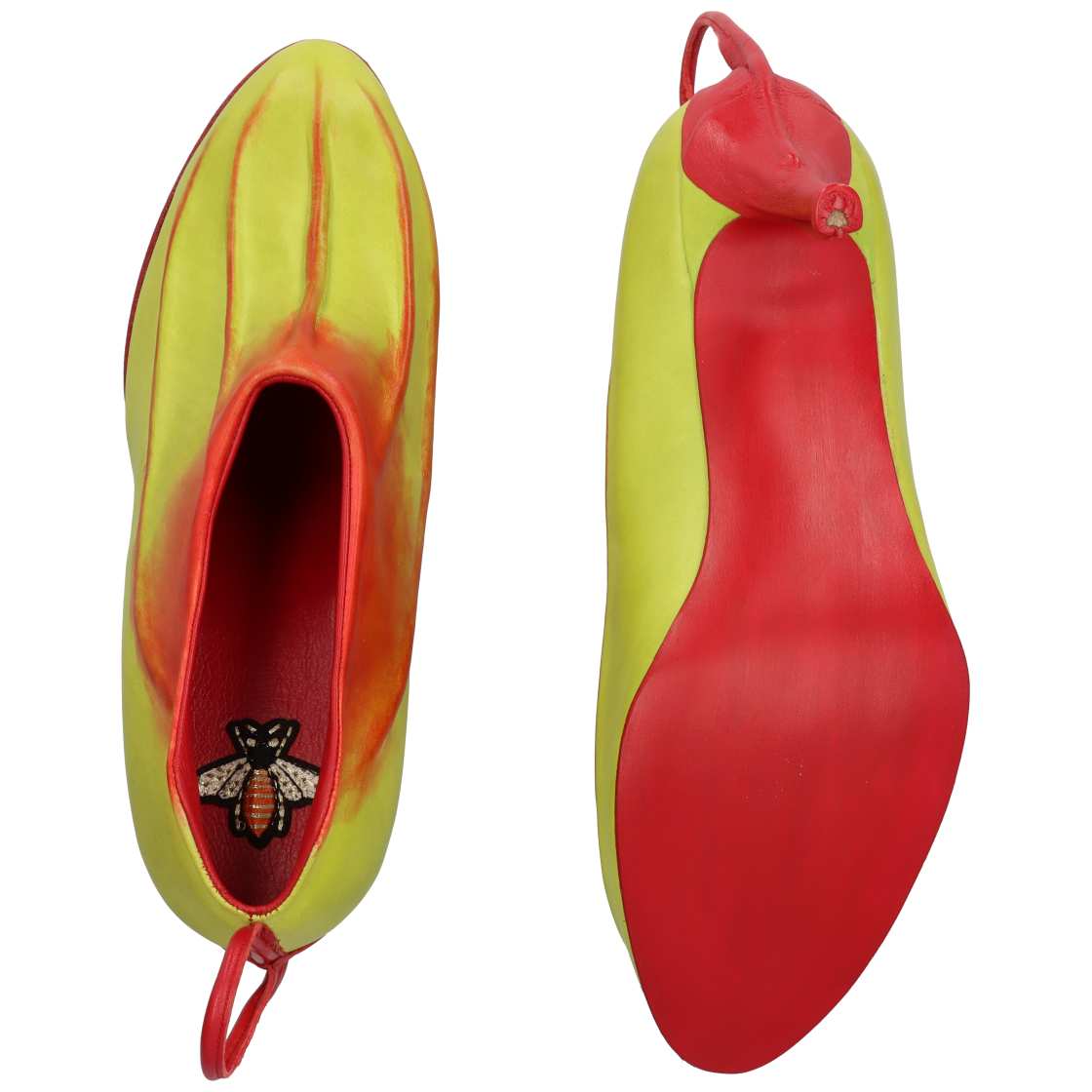 食虫植物の代表格であるウツボカズラが持つ自然の造形美と虫を誘引する為の構造を革の魅力であるしなやかさで靴に表現したいと考えデザイン。ウツボカズラの捕虫袋をモチーフにしたブーティをパティーヌで仕上げ、ヒールまでを包み込む⾧い棒市でつるを表現。禍々しい美しさに思わず引き寄せられ足を入れたくなるような個性的なデザインで視線を足元に釘付けにする。