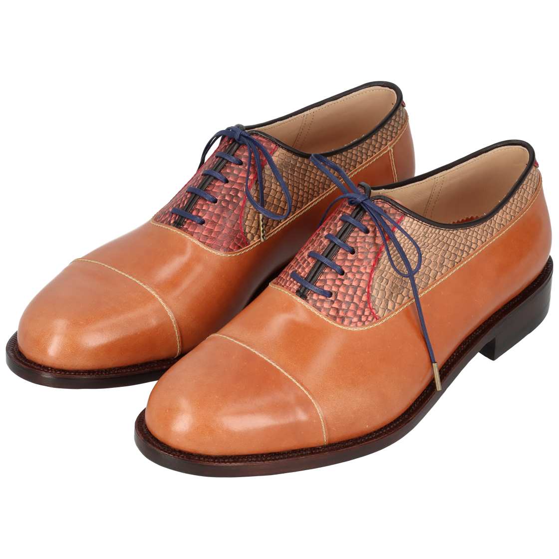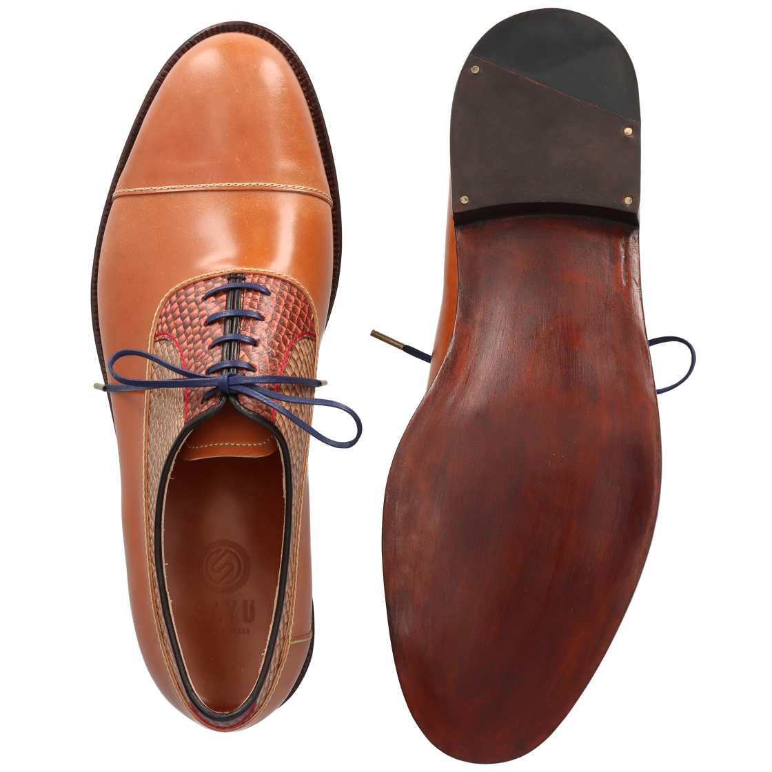 一日何tも廃棄されるタイヘイヨウザケの革とコードバンを使用して製作した靴。