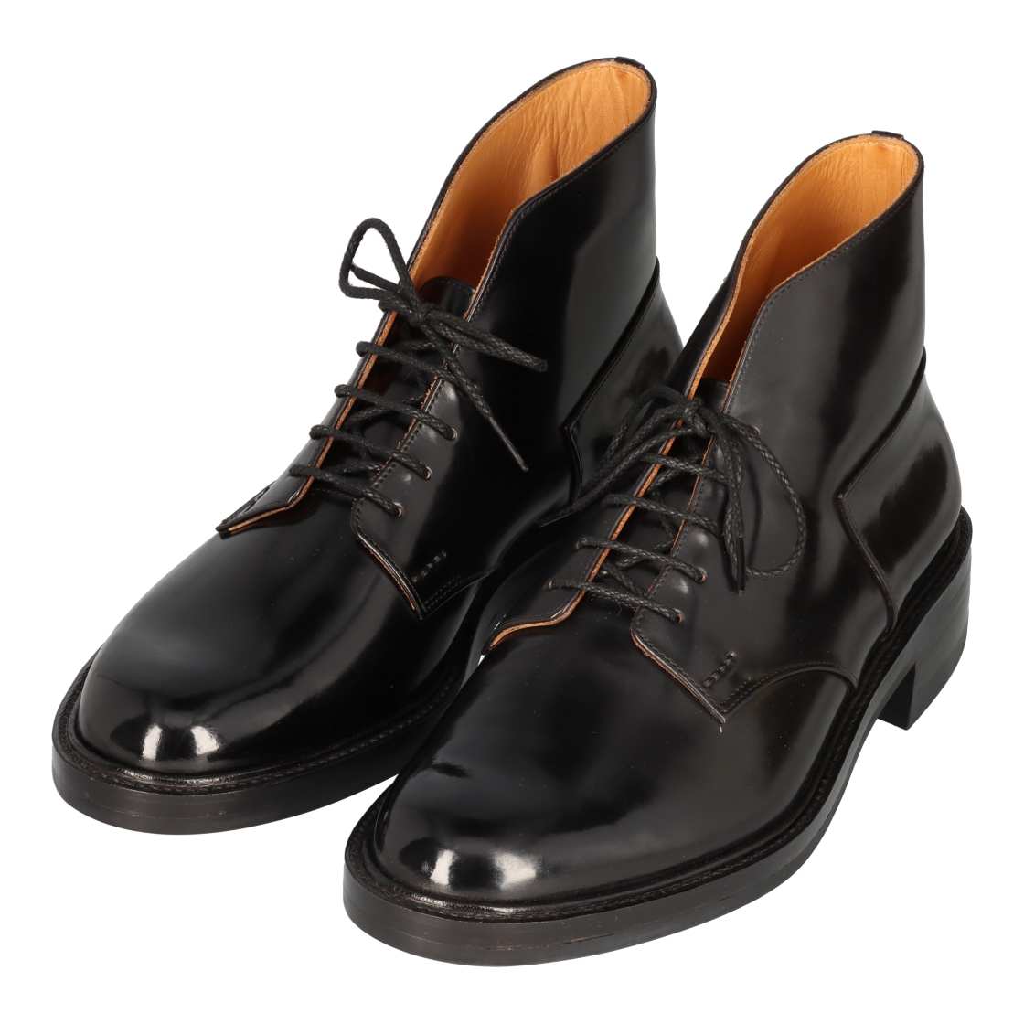 <ディテール>外羽根のブーツで設計。羽根の可動域が大きく、足の大きさ変化(むくみ等)を紐調整が容易の為。全てのパーツを折込みで製作、全体的な統一感と繊細さ/エレガントさを演出。無骨なイメージのブーツを優美に魅せる事を意識して